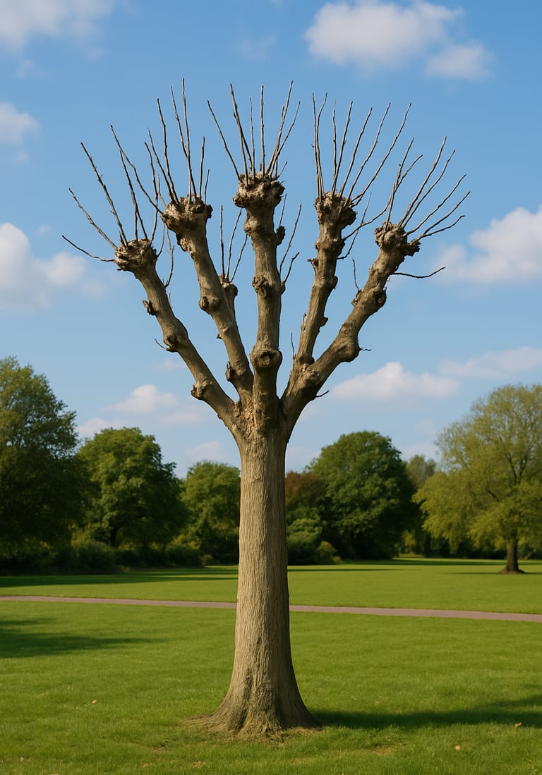 The main branch systems of trees are pruned heavily to short stubs. This promotes vigorous young re-growth from the stumpy branches. It is often used in urban areas to reduce the crown size of old street trees.